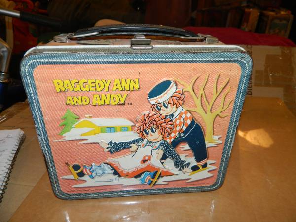 SELLING THIS VINTAGE RAGGEDY ANN AND ANDY METAL LUNCHBOX FROM 1973 IN GOOD SHAPE ASKING $24.00 CALL OR TEXT (five five nine-nine two zero-one seven three eight)