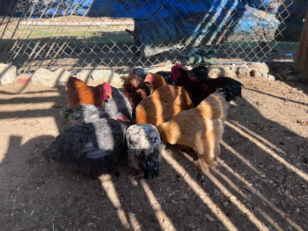 Bantam Cochin 10 2 roosters 3 grey hen 3 blonde hen 1 frizzle hen 1 patterned hen 220$ all 10 Only one grey hen does not have feathered feet