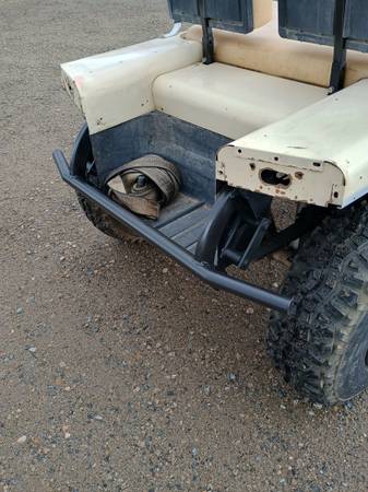 1990s Ez Go. Custom lifted suspension. Tubular front light light bar with 4 light mounts. "Bobbed" rear frame and bucket. Tubular rear bumper. New parts installed last year: 6 batteries/brake shoes...